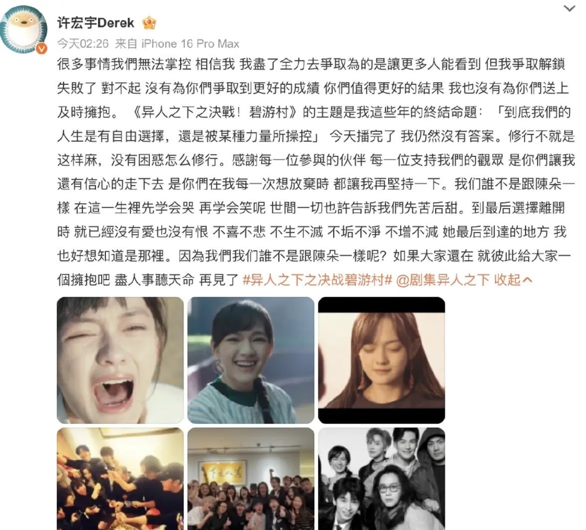 2月2日,电视剧《异人之下之决战!碧游村》收官后导演许宏宇发文,疑似为播放量不佳道歉。他称很多事情无法掌控:“我尽了全力去争取为的是让更多人能看到,但我争取解锁失败了,对不起,没有为你们争取到更好的成绩,你们值得更好的结果。”并表示自己尽人事听天命。彭昱畅 、王影璐、代斯、孙泽源、宋家腾等纷纷在评论区为其加油打call。